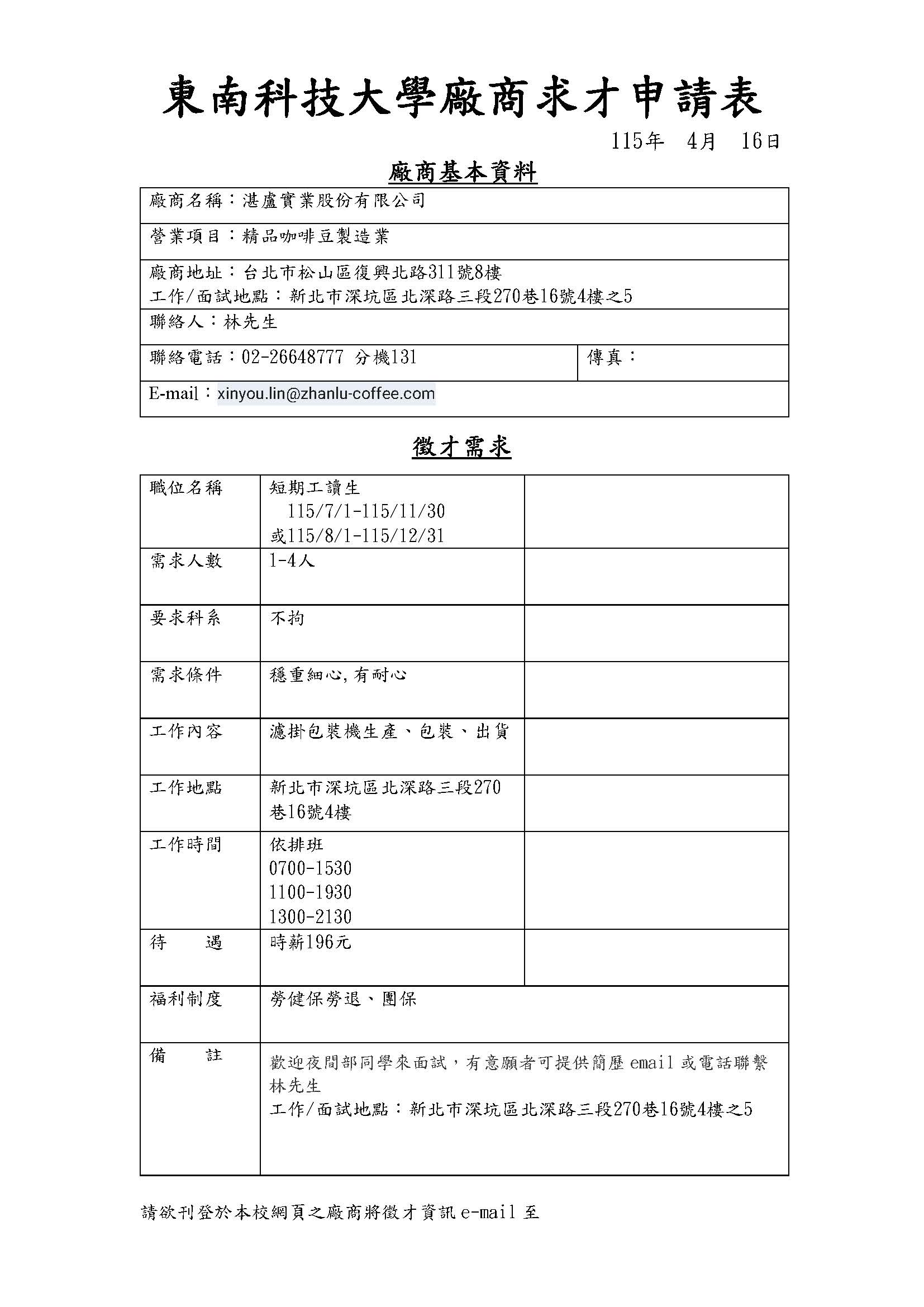 职位名称: 短期工读生