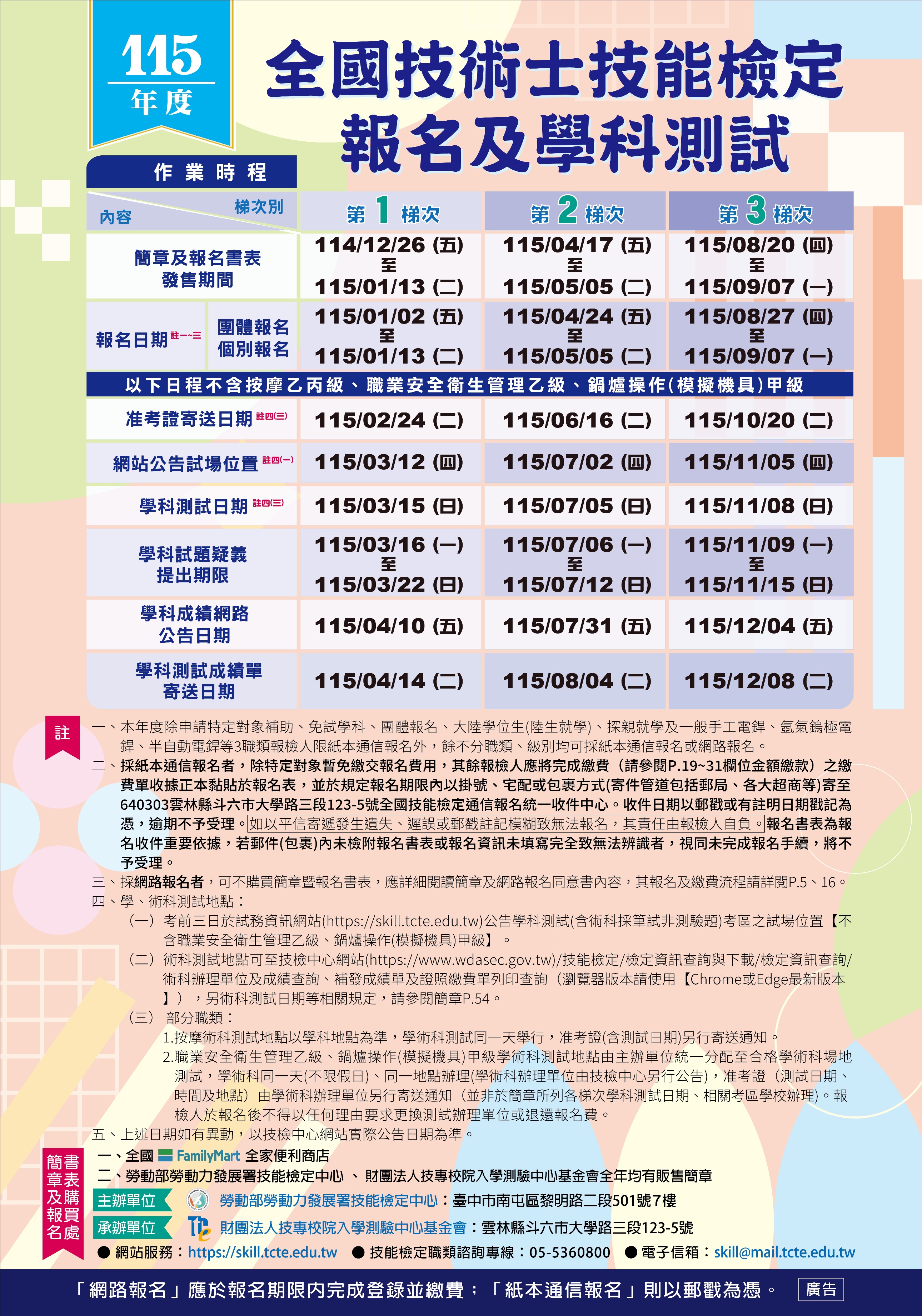 115年度全國技術士技能檢定簡章114.12.17 2026-01-02 詹 維敏 校外訊息 115年度全國技術士技能檢定簡章第1版-114.12.17.pdf 115年度全國檢定報名及學科測試-海報.jpg